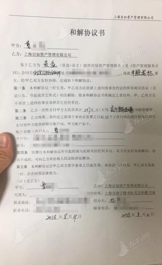 9月6日下午,东方网·纵相新闻记者在上海市永泰路上一小区里,见到了曹女士。过去3个月,她同样也是自如租房平台的租客,同样被“疑似甲醛超标”问题困扰,最令她费解的是,明明和自如签订了“和解协议”,最后却成了“空头支票”。