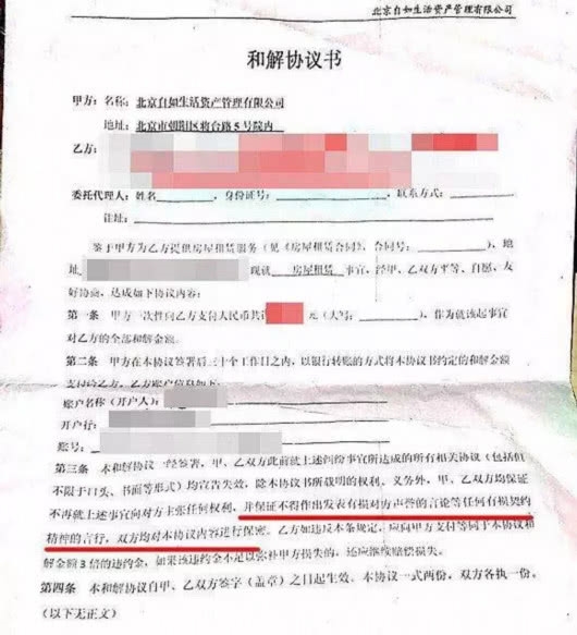 “管家提出让我换租我表示不能接受。然后管家就说,要签和解协议才能给我上北京总部走流程要赔偿。”曹女士心想,可以要回一个月2060元的租金作为赔偿,当即就在“和解协议”上签了名。