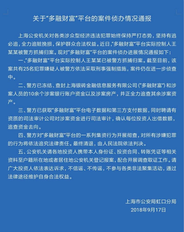 2018年7月11日,上海市公安局虹口分局根据群众举报线索,对上海银砖金融信息服务有限公司(“多融财富”)涉嫌非法吸收公众存款罪开展侦查,当天即抓获涉案人员24名。随后,分局抽调精干警力开展专案侦查,迅速冻结、查封上海银砖金融信息服务有限公司(“多融财富”)和涉案人员的10余个银行账户资金以及涉案房产,并全力追查其余涉案资产。