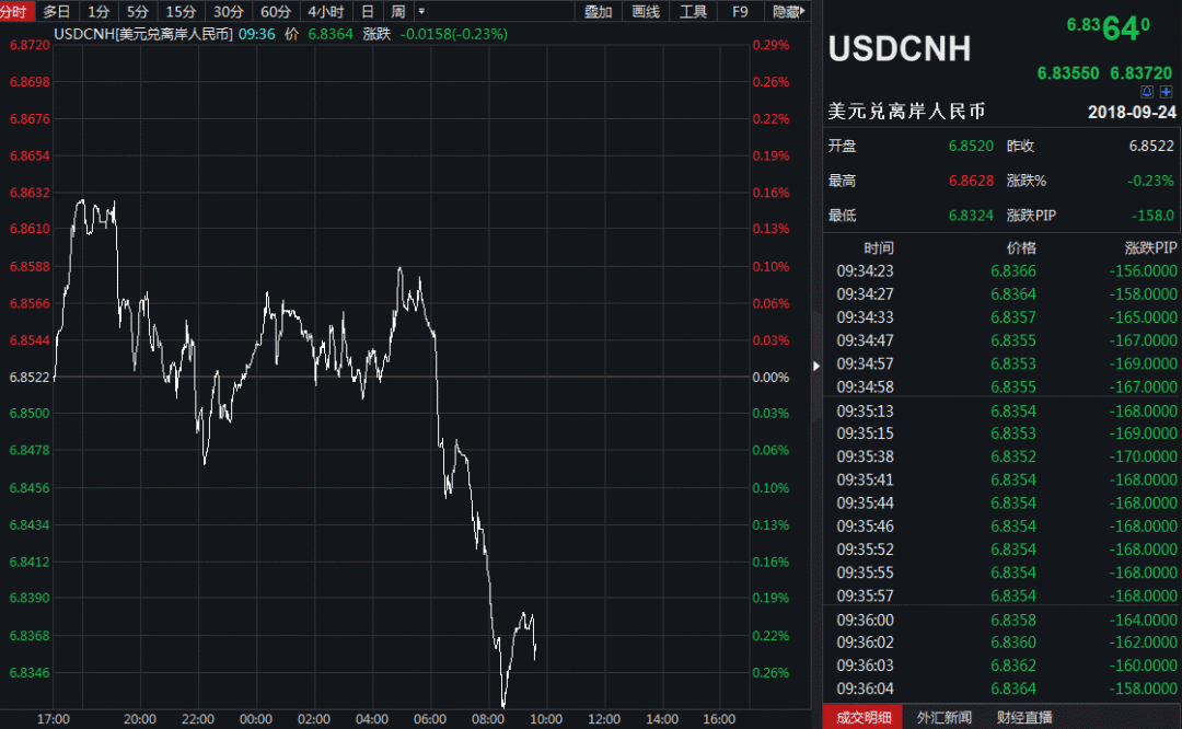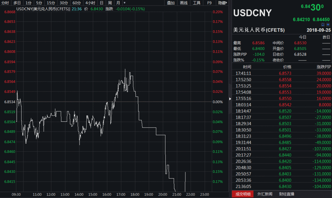 消息公布不久后,离岸、在岸市场人民币汇率企稳回升。截至发稿时间,美元兑人民币报价6.843,下跌104个基点。美元兑离岸人民币报价6.8364,下行158个基点。