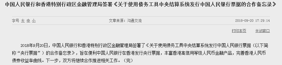 据人民银行网站消息,2018年9月20日,央行和香港特别行政区金融管理局签署了《关于使用债务工具中央结算系统发行中国人民银行票据的合作备忘录》,旨在便利央行在香港发行中国人民银行票据(以下简称“央票”)。下一步,双方将继续合作推进相关工作。