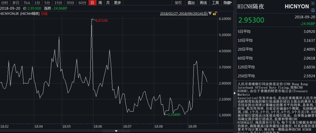 近期,离岸人民币利率高企,一度吸引部分境内资金流出套利。9月20日,人民币Hibor隔夜利率报2.953%,较隔夜Shibor高出43.4个基点。