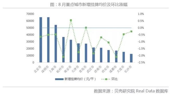 其中,深圳以4.9%的跌幅居于首位,均价绝对水平降至2017年以来低位;上海均价环比下跌3.8%,近4月均价跌幅持续扩大;青岛均价环比下跌1.5%,受4月中旬调控影响,6-8月均价持续下跌;