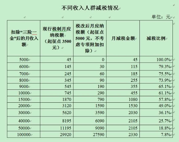 事实上,财政部、国家税务总局之前明确发文确定,从今年10月1日起,先行对纳税人实际取得的工资薪金所得按每月5000元的基本减除费用,也就是我们通常说的起征点进行扣除,并适用新税率表。