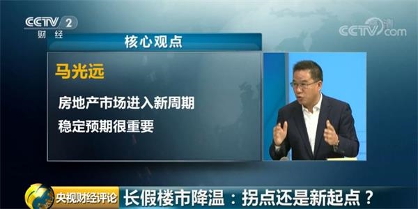 央视财经评论员马光远:房地产市场其实进入到一个新的周期,企业如果对这个市场未来的裂变有深刻认识,可能会活得更好。对于普通老百姓来讲,可能不是简单的看价格、看交易量,而要更多地看到这个市场在新的周期会带来更多不一样的东西。当下很重要一点是要稳定整个房地产市场的预期,告诉大家在中国城镇化没有完成的情况下,市场既不是有些人说的很惨的周期,也不是白银周期。