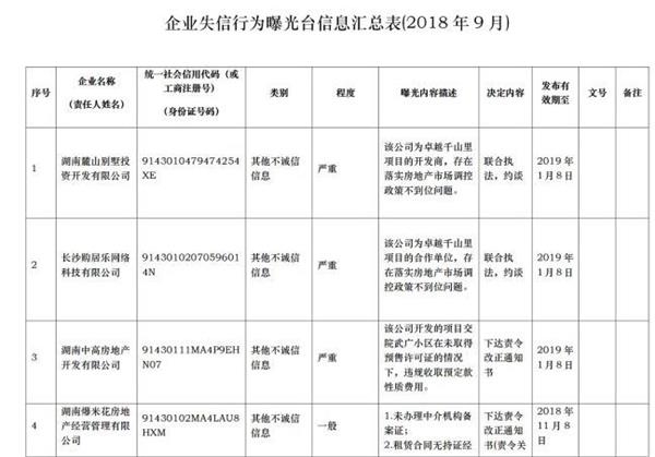 10月9日,长沙市住建委发布了9月份的企业失信行为曝光台信息汇总表。长沙卓越千山里项目的开发商湖南麓山别墅投资开发有限公司,及该项目的合作单位长沙购居乐网络科技有限公司,因雇托制造楼盘热销假象被媒体曝光,未落实房地产市场调控政策,被记入严重失信“黑名单”。