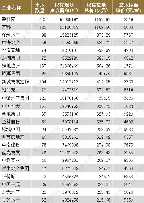 部分房企拿地数量和成本比较
