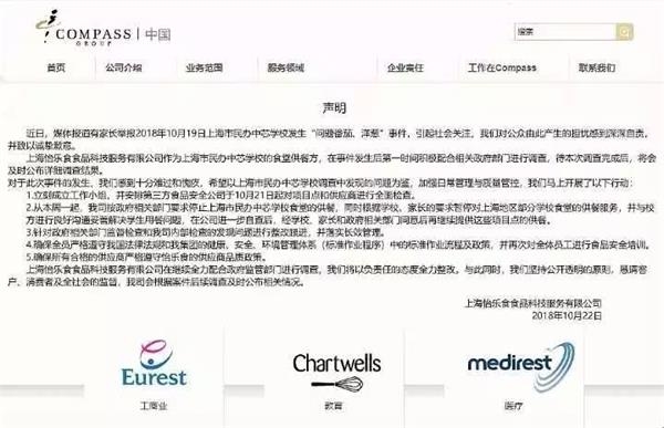 10月22日,康帕斯中国的官网上发布一份上海怡乐食食品科技服务有限公司署名的声明:近日,媒体报道有家长举报2018年10月19日上海市民办中芯学校发生“问题番茄、洋葱”事件,引起社会关注,我们对公众由此产生的担忧深感自责,并致以诚挚歉意。