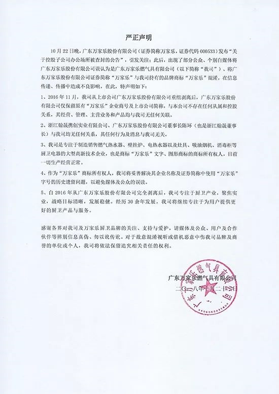 根据声明,2016年11月,万家乐燃气具从上市公司万家乐股份重组剥离后,万家乐股份仅保留原有“万家乐”企业商号及上市公司简称,与万家乐燃气具不存在任何从属和控股关系,其经营、管理、主营业务和产品均与万家乐燃气具无任何关联。
