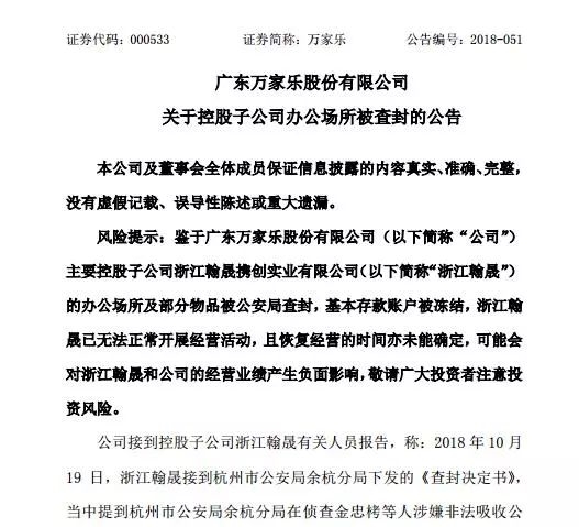 据万家乐公告披露,公司接到控股子公司浙江翰晟有关人员报告,10月19日,浙江翰晟接到杭州市公安局余杭分局下发的《查封决定书》,当中提到杭州市公安局余杭分局在侦查金忠栲等人涉嫌非法吸收公众存款案件中,发现浙江翰晟持有的部分财物、文件可用以证明犯罪嫌疑人有罪或无罪。