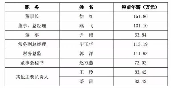 其中包括董事长徐红,税前年薪151.86万元,董事、总经理燕飞,税前年薪131.10万元,董事尹艳,税前年薪63.84万元,财务总监郭洋,税前年薪111.93万元。
