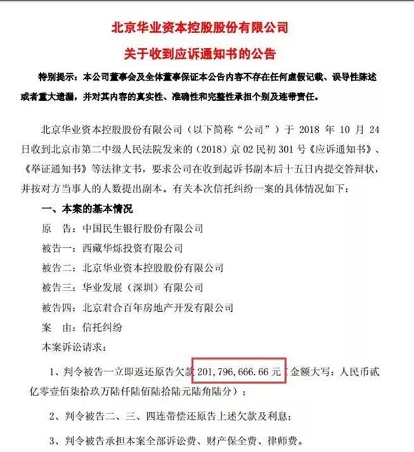 10月9日晚间,华业资本表示,收到北京第四中级人民法院《应诉通知书》和《起诉状》,民生银行北京分行为原告,华业资本和子公司北京君合百年房地产开发有限公司为被告。