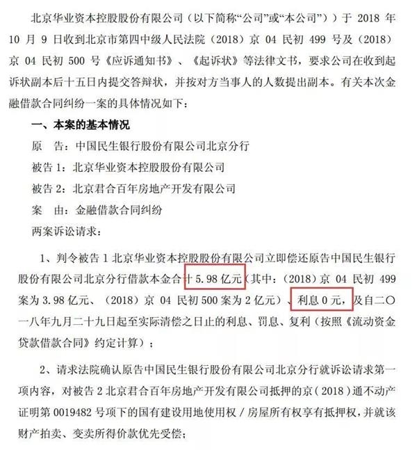 不断的利空出现,民生银行慌了,担心华业资本还不起,就把华业资本告上法庭,要求偿还借款本金合计5.98亿元。