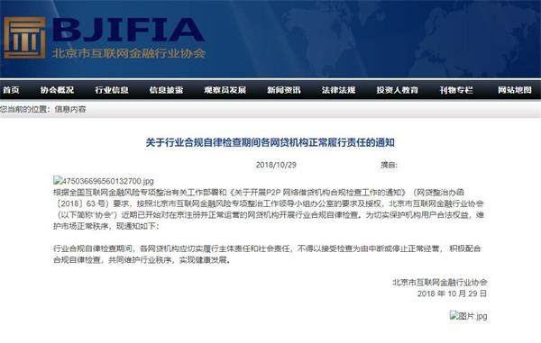昨日,北京市互联网金融行业协会(以下简称“北京互金协会”)发布《关于行业合规自律检查期间各网贷机构正常履行责任的通知》,要求各网贷机构,在行业合规自律检查期间,切实履行主体责任和社会责任,不得以接受检查为由中断或停止正常经营, 积极配合合规自律检查。