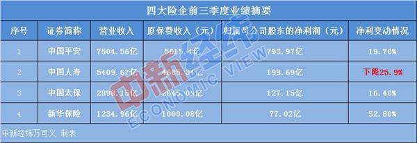 四大险企成绩单公布:前三季日赚超4亿 中国平安“最赚钱”