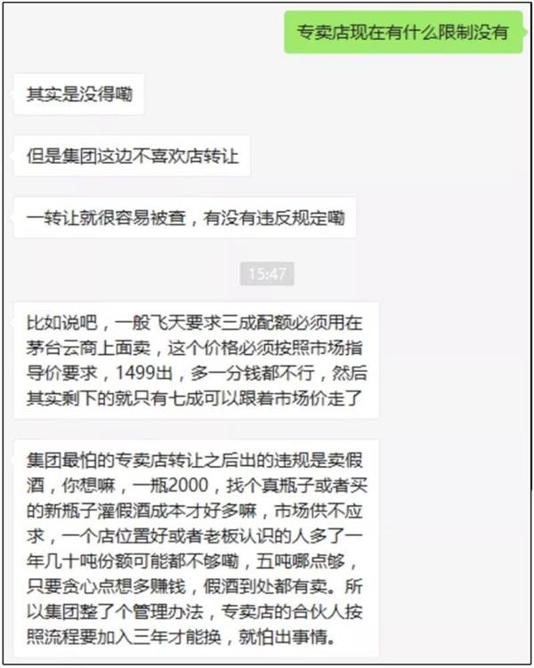 茅台集团不喜欢专卖店转让,因为会给专卖店售卖行为管控带来更大的困难,如果给消费者造成损失毁坏了商誉就更不好了。