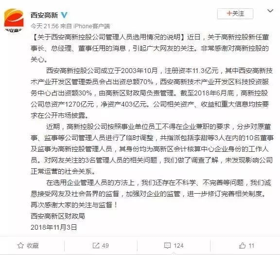 11月3日晚间,西安高新区财政局通过西安高新技术产业开发区官方微博“西安高新”发布西安高新控股公司管理人员选用情况说明,回应“80后执掌千亿国企”。“西安高新”称,对网友关注的3名管理人员的相关问题,我们做了调查了解,未发现影响公司正常运营的社会关系。
