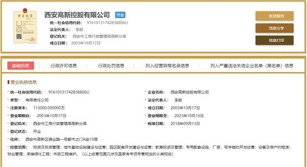 公开资料显示,西安高新控股有限公司确实是一家国企,成立于2003年10月17日,注册资本11.3亿元,股东为持股70%的西安高新技术产业开发区管理委员会、持股30%的西安高新技术产业开发区科技投资服务中心,主营业务为工业地产业务、物业管理收入、污水处理业务、基础设施建设业务等。