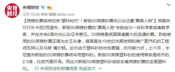 【英镑钞票或将迎来“塑料时代”!新版50镑钞票征集票面人物】新版50英镑塑料钞的使用寿命是纸币的2.5倍,比纸币更环保。而此次新版50英镑塑料钞或标志着英镑钞票的全面塑料化。(央视财经)