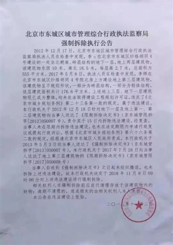 2012年12月17日,城管部门执法人员在检查中发现,李某在纱络胡同4号建了一处坐北朝南、砖混结构,地下一层、地上两层的违法建设,该建筑东西宽10米,南北进深18.5米,层高2.7米,总面积555平方米。第二天,执法人员就下达了《限期拆除决定书》,责令其15天内拆除,但李某没有自拆。