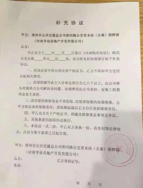 记者从这份《补充协议》中看到,主要涉及内容有两方面:一是房屋产权证书;二是暖气问题。