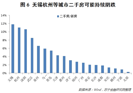其次,新房倒挂城市二手房价会持续阴跌。2016年10月开始,主要一二线城市对新房采取限价措施,所以一旦市场调整,这类城市二手房市场会进入无流动性的阴跌状态(参见图6)。