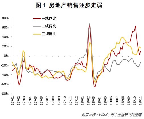 首先,从销售角度来看今年房地产市场的走势。总体而言,今年房地产市场在5月出现回暖,但此次回暖持续时间较短,金九银十旺季不旺、销售不佳,部分城市传出十一楼盘降价促销的消息。从数据来看,三线城市8月开始销售增速明显下滑,一线城市销售增速在10月后开始下滑,而二线城市销售增速持续较弱(参见图1)。