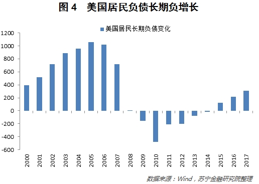 直到2015年,美国居民才重新增加长期贷款,但2017年长期贷款增加3000亿美元,还不到2000年的4000亿美元水平。因此,居民的杠杆周期调整缓慢,一旦居民被迫进行去杠杆,则在很长时间内都会处于压缩消费、偿还贷款的状态中。与居民按揭贷款意愿较低相对应,美国房价也从2007年持续下跌至2012年,下跌周期长达6年左右。
