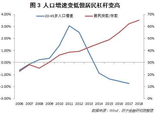 首先,从人口和杠杆来看,房地产市场面临较大的下行压力。2014年后,我国20岁至45岁人口增速已经转负,刚需的基础逐步减弱,户均住宅1.1套表明改善需求是房地产下半场的主角。硬币的另一面,则是我国居民杠杆持续走高,表内居民贷款与存款的比率已经从2006年的23%提升至2018年9月的65%,在全民借贷以至于需要缩衣节食来还贷的环境下,继续加杠杆买房的空间已经十分有限(参见图3)。