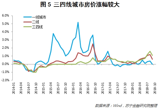 首先,棚改货币化政策退出,三四线城市房价调整压力大。2016年底随着一二线城市房地产调控力度加强,三四线城市房价伴随着棚改货币化出现了稳定的上涨,尤其是今年,三四线城市房价涨幅明显超过一线和二线城市(参见图5)。