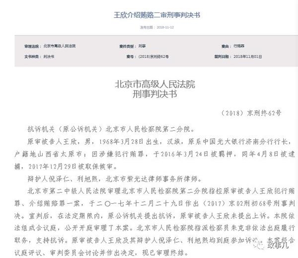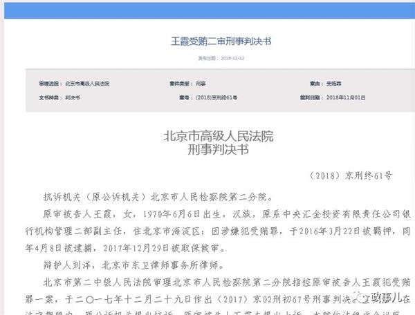 新京报记者注意到,11月9日、11月12日,北京法院审判信息网先后公开了《王欣行贿一审刑事判决书》、《王欣介绍贿赂二审刑事判决书》、《王霞受贿二审刑事判决书》。这三份判决书,揭示出上述王欣、王霞都是金融界从业人员,王欣原系中国光大银行济南分行行长,王霞原系中央汇金投资有限责任公司银行机构管理二部副主任。