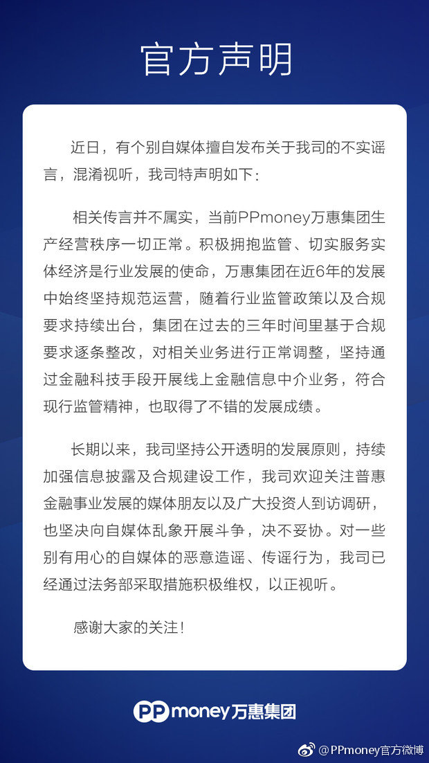 相关传言并不属实, 当前PPmoney万惠集团生产经营秩序一切正常。积极拥抱监管、切实服务实体经济是行业发展的使命,万惠集团在近6年的发展中始终坚持规范运营,随着行业监管政策以及合规要求持续出台,集团在过去的三年时间里基于合规要求逐条整改,对相关业务进行正常调整,坚持通过金融科技手段开展线上金融信息中介业务,符合现行监管精神,也取得了不错的发展成绩。