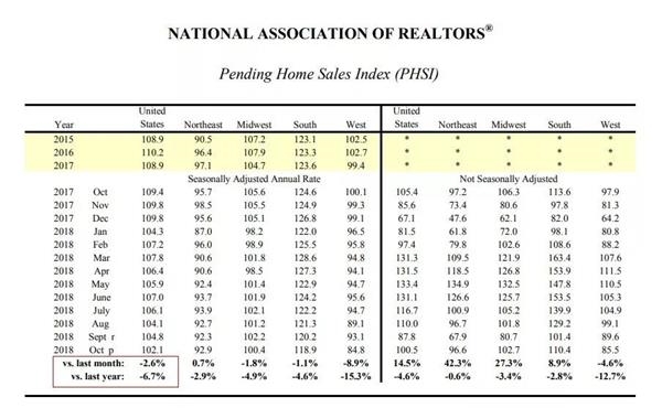 美国房地产经纪人协会(NAR)最新公布的数据显示,10月美国待售房屋销售指数下跌2.6%至102.1,创2014年6月以来的新低。