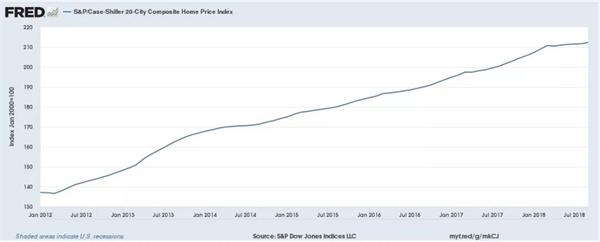 下图显示的是,2012年1月至2018年8月期间,标普/Case-Shiller 20座城市房价综合指数走势变化: