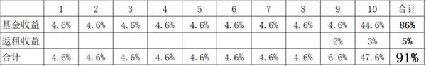一份业主提供的收益表显示,购买商铺后基金收益方面,前9年每年均能收到4.6%,第10年则可收益44.6%,合计可收益86%;返租收益则从第9年开始,第9年收益2%,第10年收益3%,合计5%,10年内基金收益和返租收益共计91%。