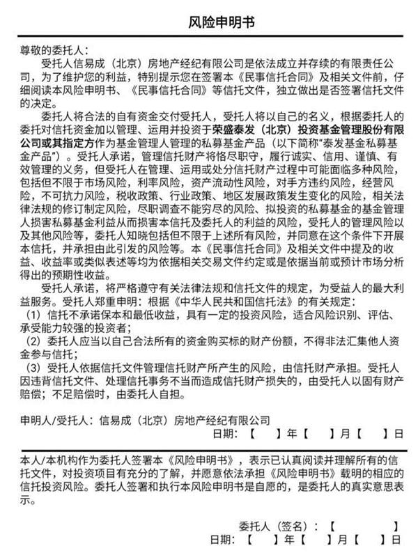 业主们提供给市界的一份荣盛让其签署的《民事信托合同》风险申明书显示,信托不承诺保本和最低收益。此外,受托人处理信托事务不当而造成财产损失的,由受托人以固有财产赔偿,不足赔偿时,由委托人(即业主)自担。