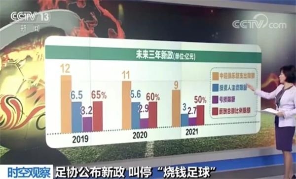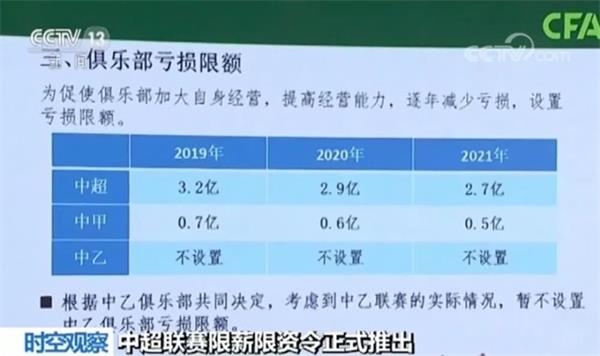 根据中国足协最新的规定,从2019赛季开始,中超联赛未来三个赛季内的俱乐部支出、投资人注册、亏损、薪酬以及奖金,都将实现限额,同时把此作为各俱乐部的准入标准。