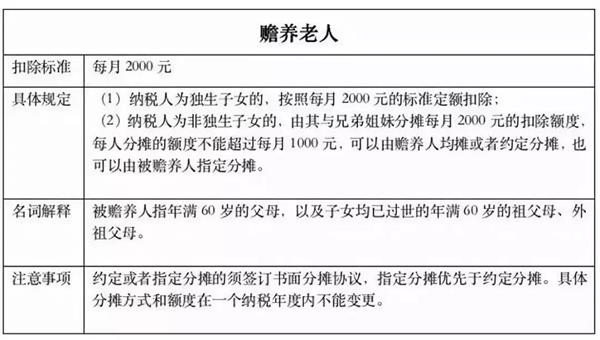 父母双方或者一方满60岁,独生子一个月抵扣两千。兄弟姐妹两人的,每人抵扣1000。如果子女已经去世了,赡养祖父母和外祖父母的孙辈也可以抵扣。