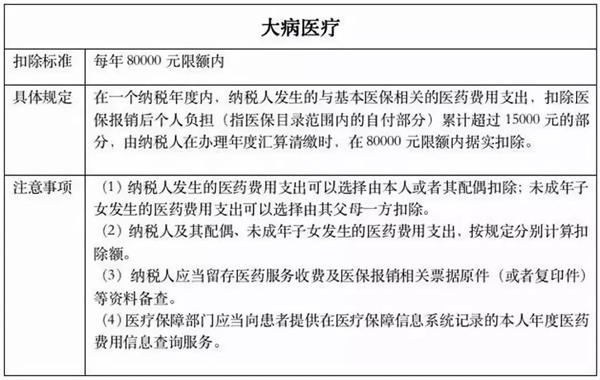 在一个纳税年度里,纳税人医保报销后个人负担,累计超过15000元,超出部分,在80000元限额内据实扣除。