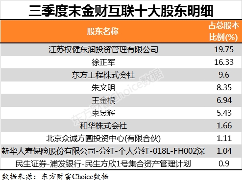 通过查询发现,截至2018年三季度末,该公司的控股股东为江苏权健东润投资管理有限公司,持股比例为19.75%,束昱辉个人直接持有金财互联5.43%的股份。此外,通过启信宝查询显示,束昱辉持有江苏权健东润投资管理有限公司23.99%的股份。