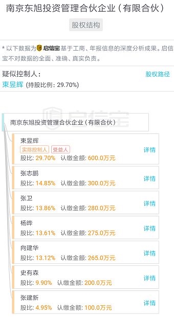 除了直接持股的金财互联之外,启信宝显示,束昱辉还持有南京东旭投资管理合伙企业(有限合伙)29.7%股权,为第一大股东。
