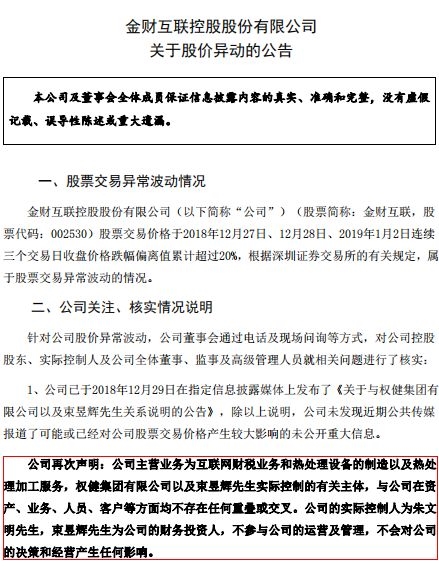 直到2019年1月2日晚,金财互联发布关于股价异动的公告,表示权健集团有限公司以及束昱辉先生实际控制的有关主体,与公司在资产、业务、人员、客户等方面均不存在任何重叠交叉,束昱辉先生为公司的财务投资人,不参与公司的运营及管理,不会对公司的决策和经营产生任何影响。至此,金财互联股价才企稳回升,近3个交易日连续收阳,收窄跌幅3.46%。