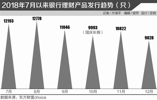 据choice统计(统计范围覆盖423家银行),7月-12月,新产品发行量数据分别为12193款、12778款、11046款、9993款(国庆长假因素)、10822款和9028款。