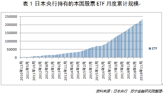 上表1展示了日本央行购入本国股票ETF的月度累计数据。从表中可以看出,日本央行累计持有的本国股票ETF持续快速上升。截至2018年年底,日本央行已持有日本股票ETF约77.5%,并因此成为东京证券交易所第一板块(共2016家上市公司)约70%上市公司的前十大股东。