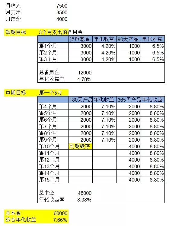 这时候,一共积累了6万本金,综合年化收益率7.23%,并且,每月可以随时取用的现金=9000备用金货币基金+1000备用金里的90天产品+2000元180天产品+2000元365天产品=14000元,基本可以兼顾流动性和收益率。