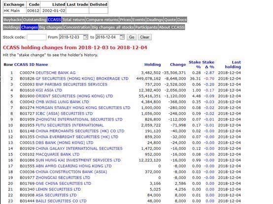 进入2018年11月之后,中国鼎益丰每天成交额均在1亿港元左右。2018年11月30日,中国鼎益丰成交突然放大,全天成交额为15.23亿港元。德银以及广发证券(香港)席位为当天卖出主力,其中德银卖出3550.6万股,广发证券(香港)卖出864.8万股。