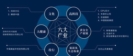 其中,文化板块包含知崇文华、瞭望中国杂志社;高科技板块有CPU芯片、丰源芯公司、志道国际、中国智能集团;大健康产业包括天问福德健康管理股份有限公司;黄金产业链包含财易通智金、坛金矿业、新加坡黄金对冲交易中心;投行业务则主要为香港的上市公司中国鼎益丰; 旅游及生态农业则主要是长白山天鼎集团。