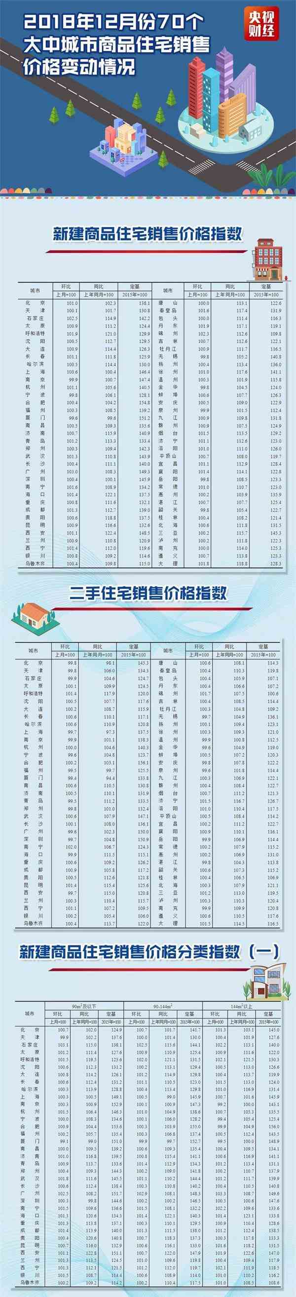 国家统计局今天发布的2018年12月份70个大中城市新建商品住宅销售价格数据显示:一线城市新建商品住宅销售价格环比涨幅扩大,二手住宅价格继续下降。