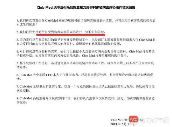 2月12日凌晨,涉事度假村亚布力Club Med对外表示,已安排对所有受到病毒危害的宾客进行三倍的慰问补偿。宾客离店后两天内去医院求诊,公司也将补偿相应的医疗费用。不过,有度假村游客告诉南都记者,担心是补偿的是“等额住宿抵用券,还在等回复。”