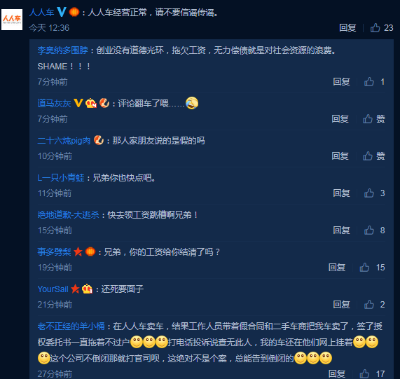 虽然辟谣,但是舆论却“炸了锅”,大家似乎更加相信“破产”传闻,更是有人发微博表示,已向人人车的朋友求证过,人人车要黄了。